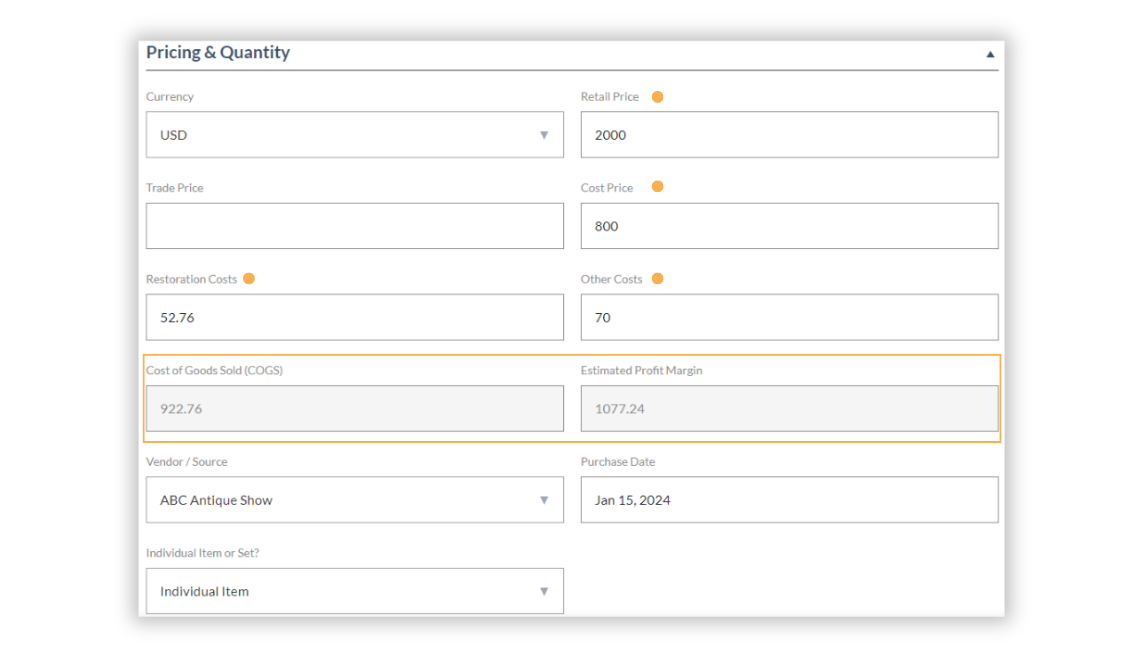 Note: The Pricing & Quantity section includes a field for Available Quantity. This field does not affect the calculations listed above: the numbers entered should be for a single item only, and the calculations for cost of goods sold and estimated profit margin will likewise be for a single item. (If several items are being sold together as a set, that set counts as one item.)