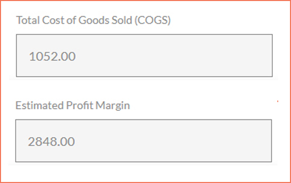 In the Pricing & Quantity section for your item, you’ll see a Total Cost of Goods Sold (COGS) and an Estimated Profit field that updates automatically based on the pricing and costs you enter for your item.