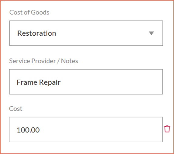 First, enter all costs associated with the item, including your Purchase Price and any additional expenses such as restoration, services, transportation, photography, or taxes. You can also add the provider name or notes for each cost to keep your records organized.