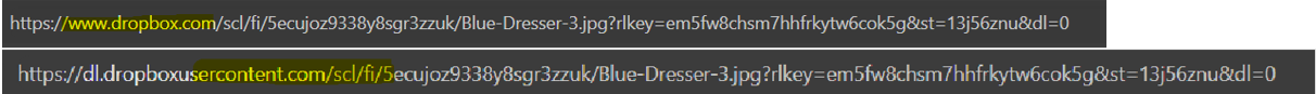 - From the pasted link, change www.dropbox to ‘dl.dropboxusercontent’ as shown below: