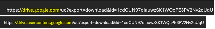 - From the pasted link, add ‘usercontent’ between ‘drive’ and ‘Google’ as shown below: